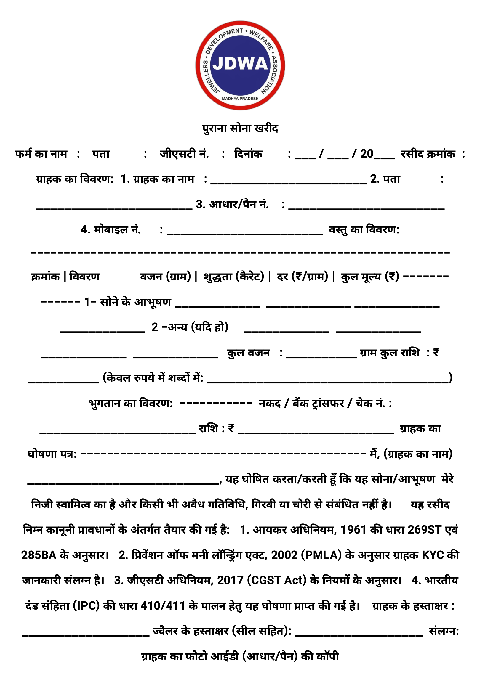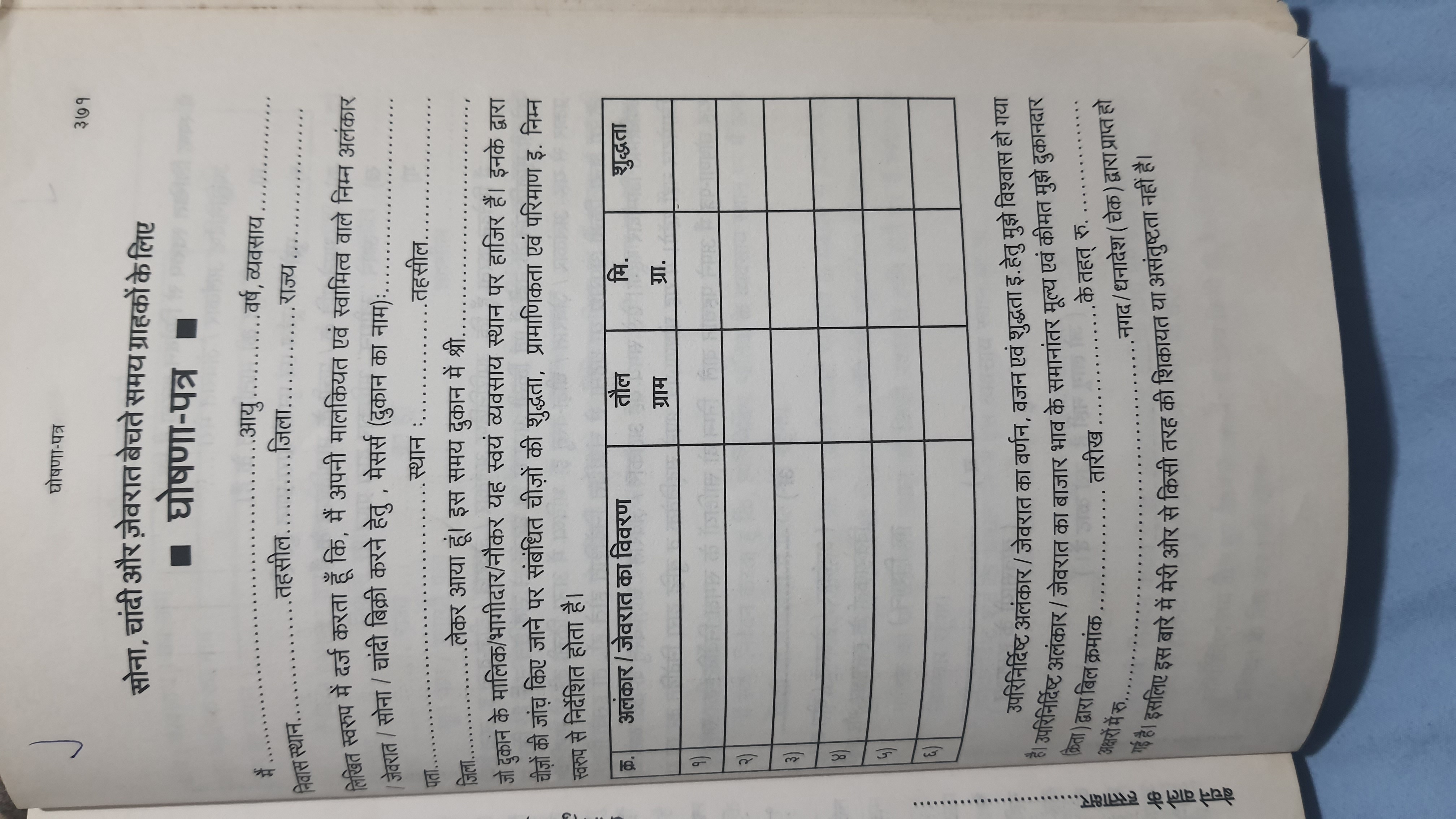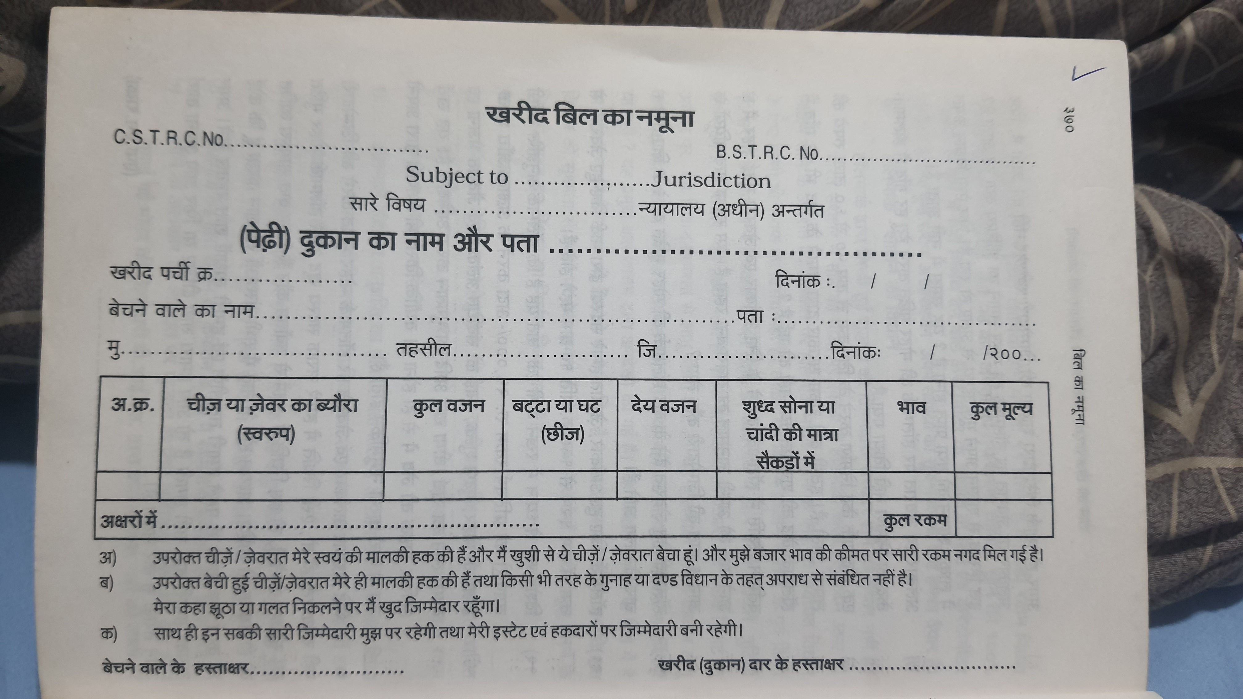 सोना चांदी बेचते समय ग्राहक से लिया जाने वाला शपथ पत्र