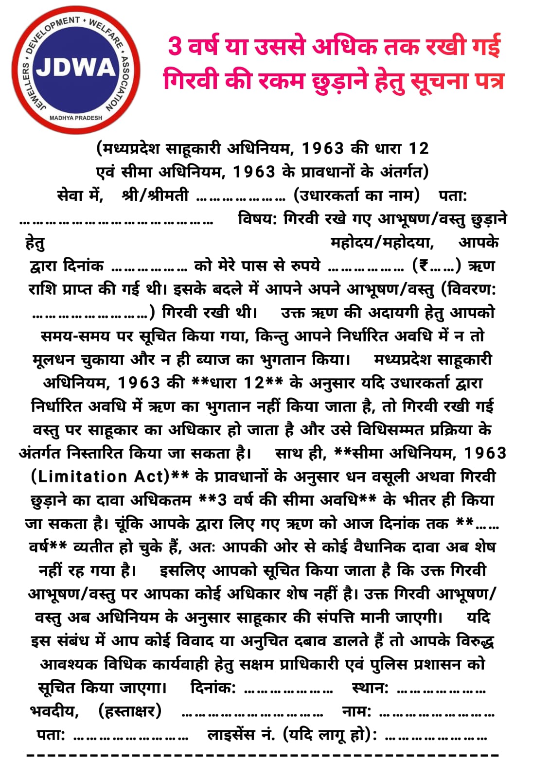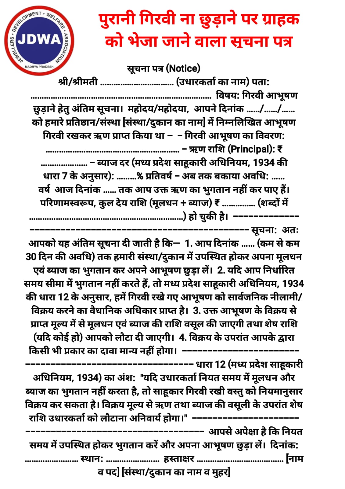 पुरानी गिरवी ग्राहक द्वारा नहीं छुड़ाने पर भेजो जाने वाला अंतिम सूचना पत्र सूचना पत्र